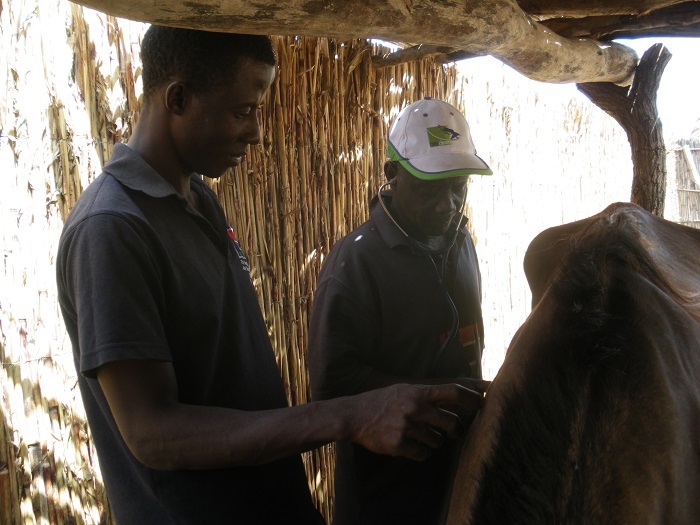 GHDT staff Alpha and Saloum examine a patient